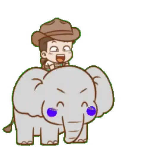 Menino de chapéu marrom montado em um elefante cinza com olhos roxos.