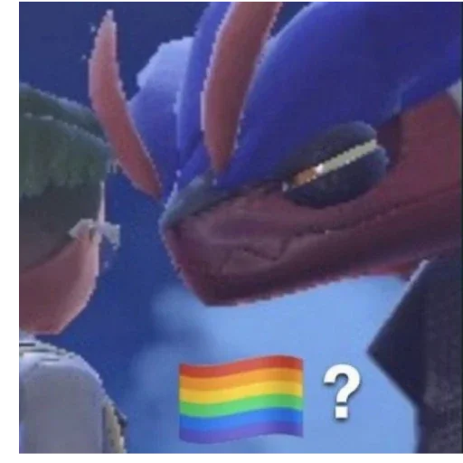 Um personagem de anime com cabelo azul e chifres laranja olha para outro personagem com uma bandeira arco-íris e um ponto de interrogação.