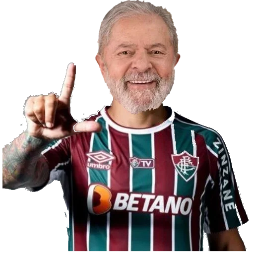 Um homem mais velho com camisa de futebol verde, vermelha e branca, fazendo um gesto com o dedo indicador para cima. A camisa tem o logo BETANO.