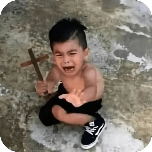 Menino de pé descalço e sem camisa, com um crucifixo na mão, fazendo careta e gesto com a outra mão, em um fundo de concreto.