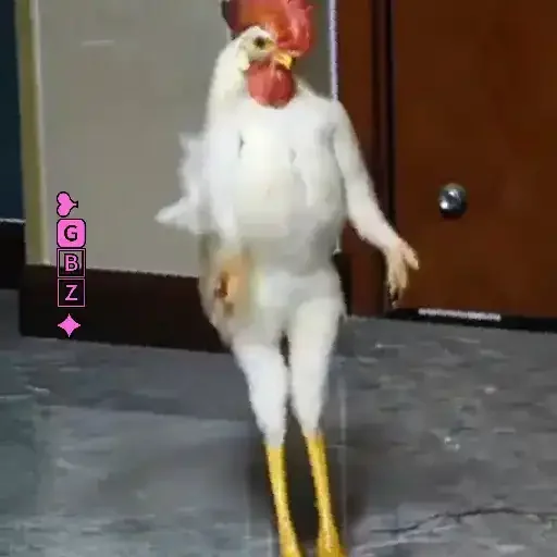 Um frango branco com pernas amarelas e bico vermelho, parecendo um personagem de desenho animado, parado em frente a uma porta.