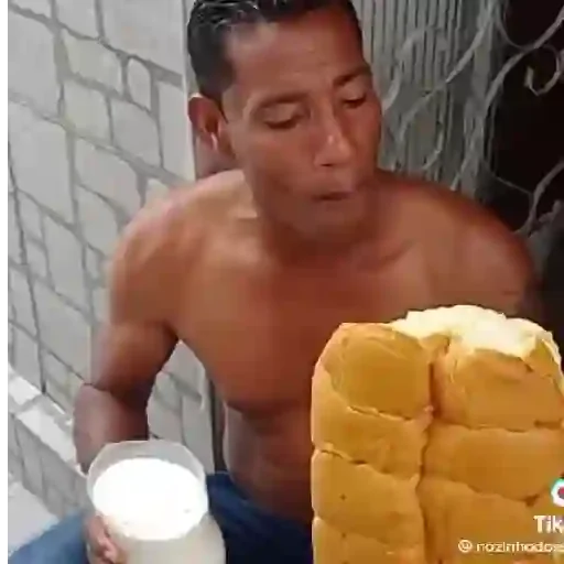 Homem sem camisa sentado com um copo de leite e uma grande fatia de pão.