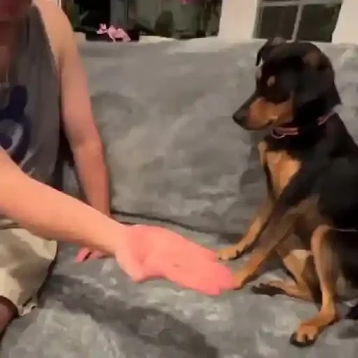 Um cachorro preto e marrom sentado no sofá ao lado de uma pessoa, com a pata sobre a mão estendida da pessoa.