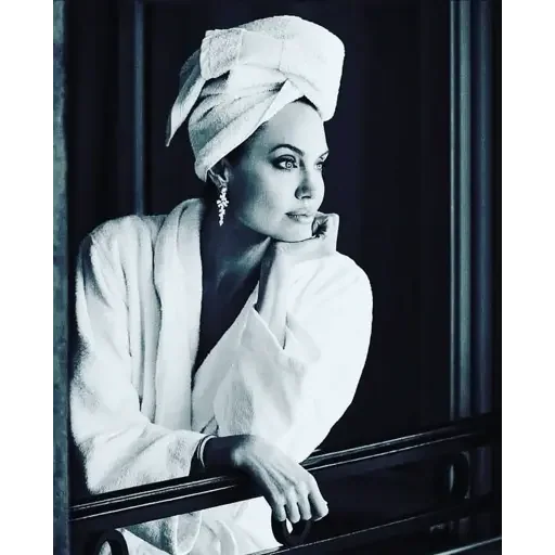 Mulher elegante com turbante branco olhando para o lado, usando um robe branco e joias.