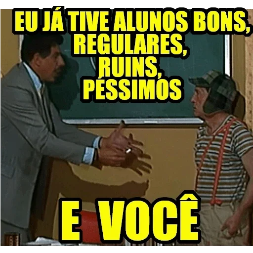 Um homem de terno e um menino com headphones estão em uma sala de aula. O homem estende a mão e diz 'EU JÁ TIVE ALUNOS BONS, REGULARES, RUINS, PÉSSIMOS E VOCÊ'.