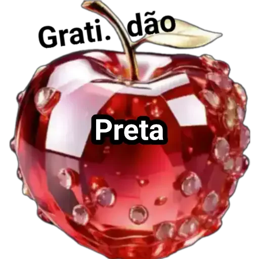 Uma maçã vermelha brilhante com gotículas de água, folhas verdes e o texto 'Grati. dão' e 'Preta' sobreposta.