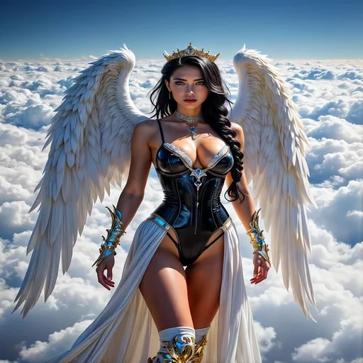 Uma mulher com asas de anjo e coroa dourada, vestindo um traje preto e dourado, está em pé sobre nuvens brancas com céu azul ao fundo.