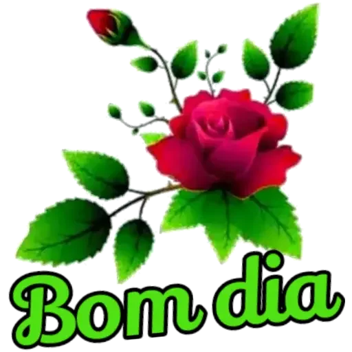 Uma rosa vermelha com folhas verdes e um botão de flor, com a frase 'Bom dia' em letras verdes.