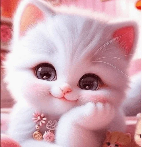 Gatinho branco fofinho com olhos grandes e orelhas cor-de-rosa, fazendo um gesto com a pata.