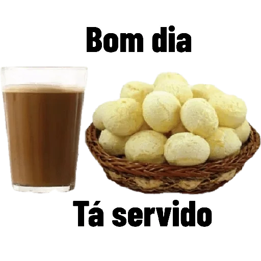 Um copo de café com leite ao lado de uma cesta de pão de queijo, com os textos 'Bom dia' e 'Tá servido'.