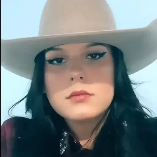 Uma mulher com chapéu de cowboy e maquiagem pesada olha diretamente para a câmera com uma expressão séria.