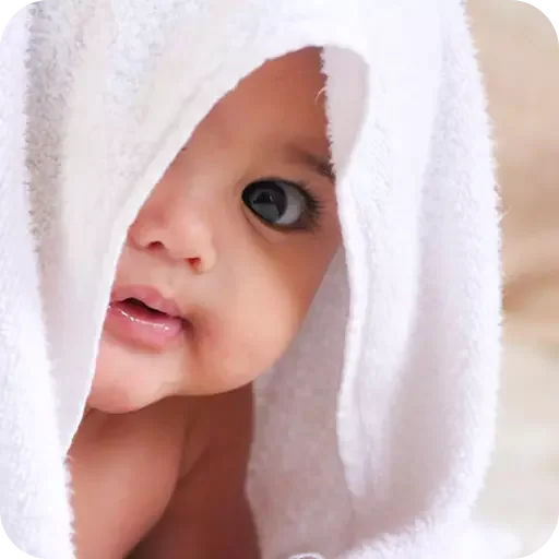 Um bebê com toalha branca na cabeça, olhando para o lado com uma expressão curiosa e olhos arregalados.