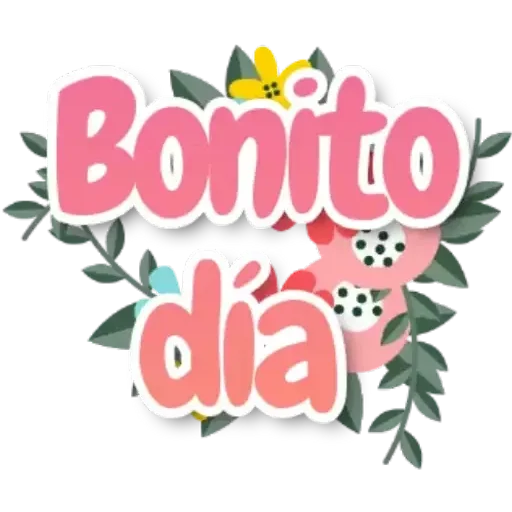 Um sticker colorido com a frase 'Bonito dia' em letras grandes e rosadas, cercado por folhas verdes, flores e borboletas.
