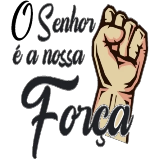 Uma mão cerrada em punho com a frase 'O Senhor é a nossa Força' escrita em cursivo.