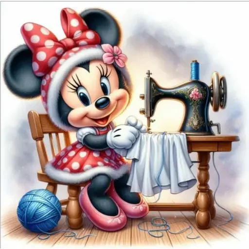Minnie Mouse sentada em uma cadeira de madeira, vestindo um casaco vermelho com branco e um chapéu com uma fita vermelha e branca, segurando um ursinho branco enquanto olha para um ursinho branco, com uma máquina de costura ao lado.