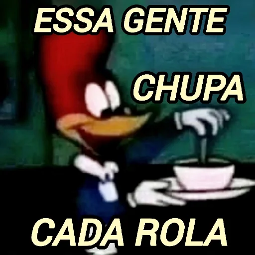 Um personagem de desenho animado, Woody, com expressão de surpresa e desaprovação, ao lado de uma xícara de chá. O texto 'ESSA GENTE CHUPA CADA ROLA' aparece em destaque.