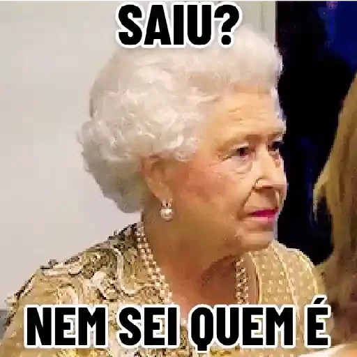 Rainha Elizabeth II com expressão confusa, vestindo joias e um look dourado, com texto "SAIU? NEM SEI QUEM É" sobreposto.