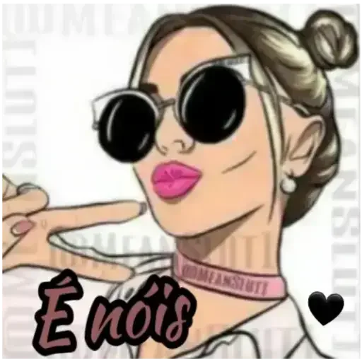 Uma mulher loira com óculos de sol e cabelo preso fazendo um gesto com a mão, com o texto 'É nois' embaixo e um coração preto ao lado.