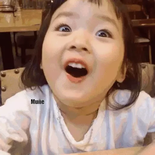 Menina com boca aberta e expressão surpresa, vestindo uma camisa listrada. Fundo desfocado.