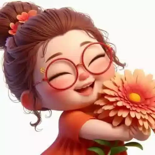 Menina de óculos vermelhos sorrindo e cheirando uma flor laranja.