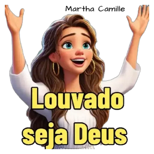 Uma mulher loira com as mãos levantadas e um sorriso no rosto, com o texto 'Louvado seja Deus' em destaque.