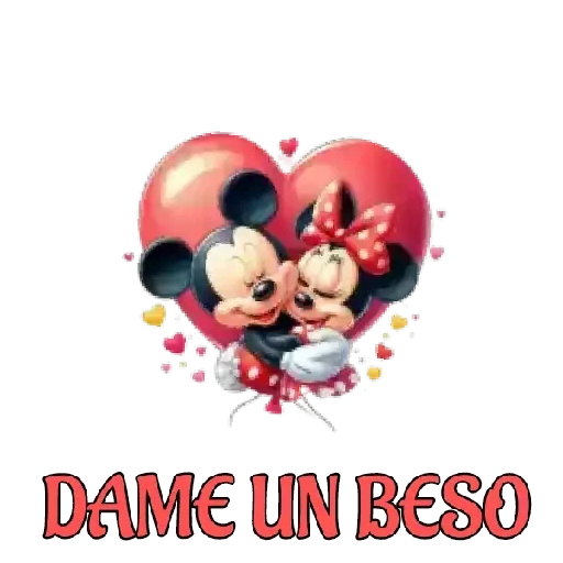 Mickey e Minnie Mouse se abraçando dentro de um coração vermelho gigante, com texto 'Dame un beso' embaixo.