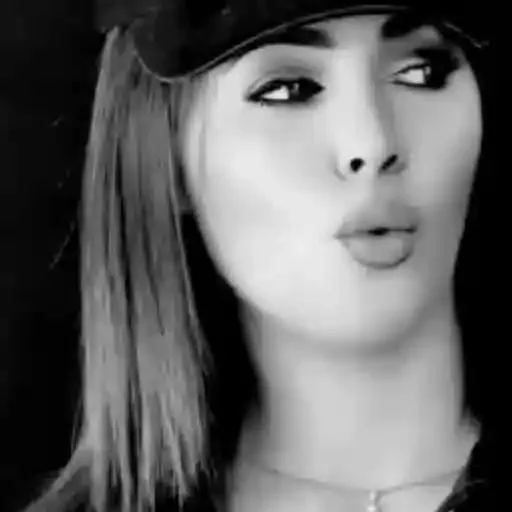 Rosto de uma mulher com expressão séria, cabelos longos e chapéu, em preto e branco.