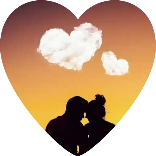 Um casal se beijando em silhueta contra um pôr do sol com nuvens em forma de coração.