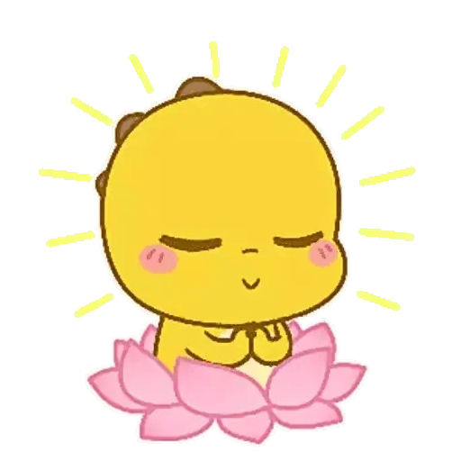 Um desenho de um pássaro amarelo com olhos fechados e mãos unidas em meditação, sentado em uma flor rosa, com linhas amarelas ao redor representando auréola.