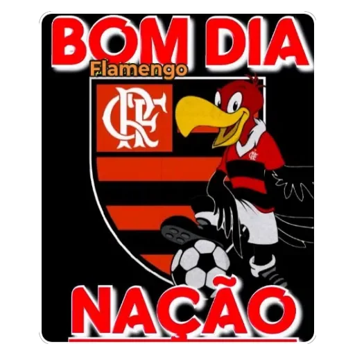 Um escudo do Flamengo com um urubu cartoonizado em frente, com a frase 'BOM DIA NAÇÃO' em letras grandes vermelhas. O escudo tem listras vermelhas e pretas e o logo CRF no canto superior esquerdo.