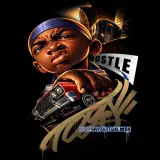 Menino com expressão séria, usando um boné azul e dourado, com um carro de brinquedo e a palavra 'HUSTLE' ao fundo.