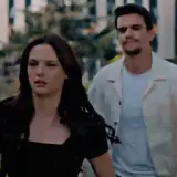 Um casal caminhando ao ar livre, a mulher à esquerda com cabelo preto e um vestido preto, o homem à direita com cabelo…