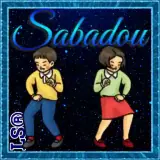 Dois personagens de desenho animado dançando com a palavra 'Sabadou' em letras azuis acima deles. O menino está com uma…