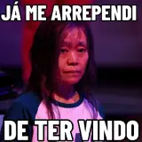 Menina com expressão de arrependimento e texto "JÁ ME ARREPENDI DE TER VINDO" sobre a imagem.