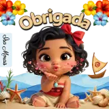 Uma menina com cabelo escuro e um laço vermelho no cabelo, beijando a mão, com o texto 'Obrigada' acima dela. Ela está…