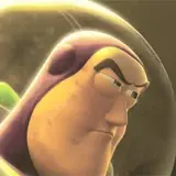 Buzz Lightyear com expressão séria e olhar para o lado, dentro de uma cápsula espacial com luz amarela.