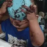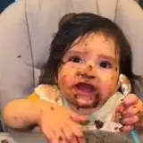 Menina com expressão de desinteresse ou desgosto, com marcas de chocolate no rosto. Sobreposto, um retângulo preto com…