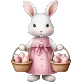 Um coelho branco fofinho vestindo um vestido rosa com um laço na frente, segurando duas cestas de vime cheias de ovos…