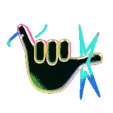 Mão preta com dedos indicadores para cima, contorno colorido e linhas azuis diagonais.