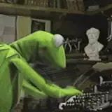 Um personagem verde, com aparência de Kermit, está curvado sobre uma máquina de escrever, com uma expressão de…