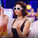Mulher com óculos de sol brancos e vestido preto, dançando em um ambiente noturno com outras pessoas ao fundo.
