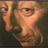 Rosto de uma pessoa com expressão de desconfiança ou surpresa, com a mão perto do nariz.