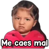 Menina com expressão de desaprovação, vestindo uma blusa rosa, com o texto "Me caes mal" sobreposto.