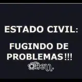 Um quadrado preto com texto branco que diz 'ESTADO CIVIL: FUGINDO DE PROBLEMAS!!!' e uma assinatura 'bell.'