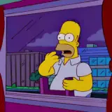 Homem de cabelos amarelos, provavelmente Homer Simpson, comendo e bebendo algo em frente a uma janela com uma paisagem…