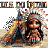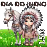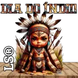 Uma boneca indígena vestida com trajes típicos ao lado de uma tenda colorida, com o texto 'DIA DO ÍNDIO' e 'LS©' na…