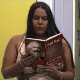 Um personagem de desenho animado branco e redondo, com olhos grandes e rosados nas bochechas, lê um livro rosa com…