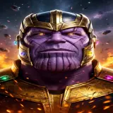 Rosto de Thanos, vilão de Vingadores, com armadura dourada e joias do infinito, fundo de estrelas e fogo.