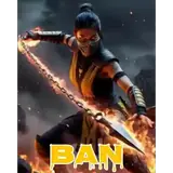 Um personagem de Mortal Kombat com uma máscara, cabelo preto preso e armadura, empunhando uma espada em chamas com a…