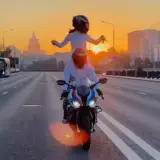 Um casal está em uma motocicleta, com a mulher sentada nas costas do homem, em uma estrada durante o pôr do sol. O…